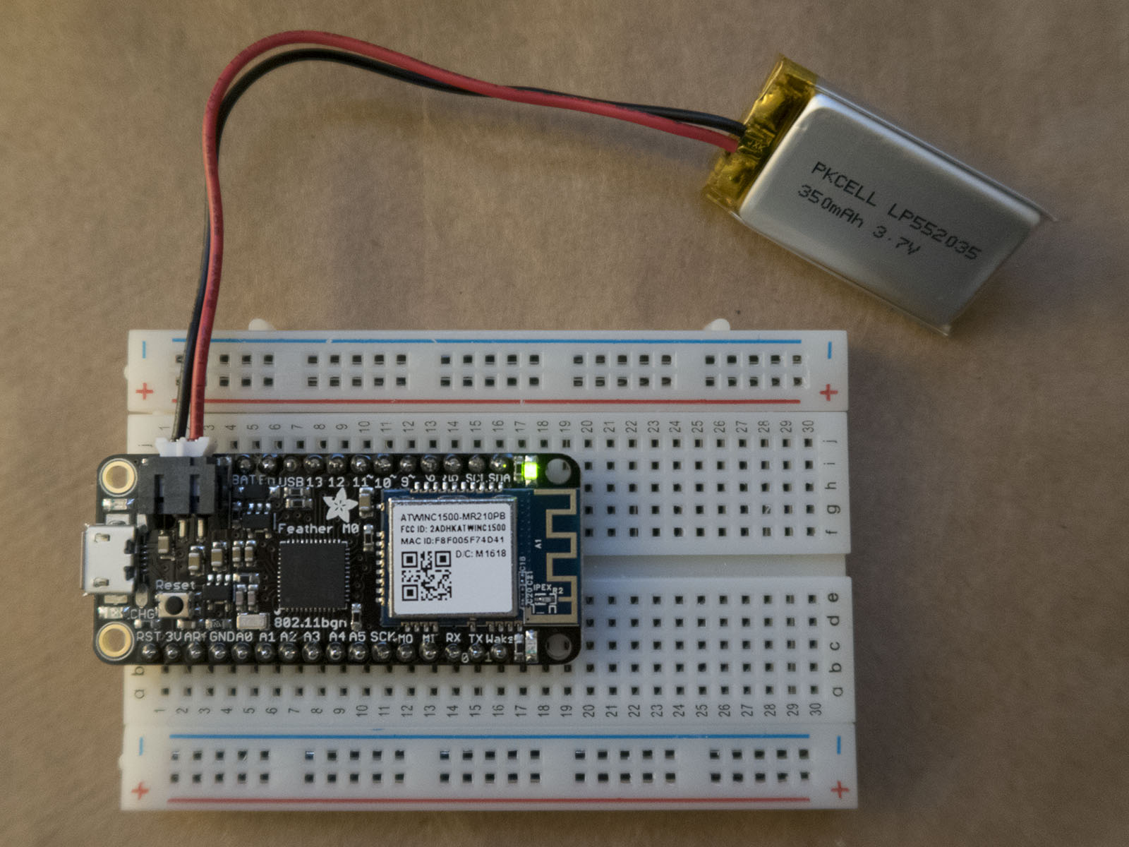 Shown below is my Feather M0 WiFi prototyping board (running a battery life baseline test). Eventually, I will want to combine this with a camera, a light, switch sensors for the door and the flag, a solar cell, and a solar charging circuit.